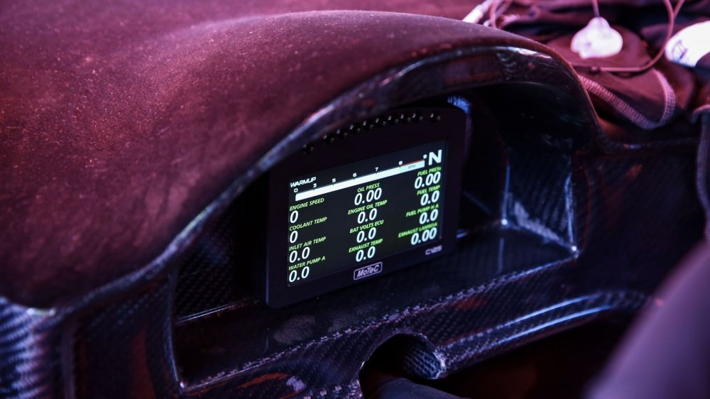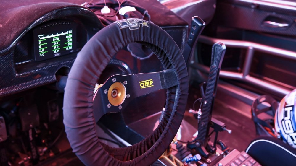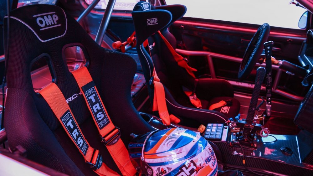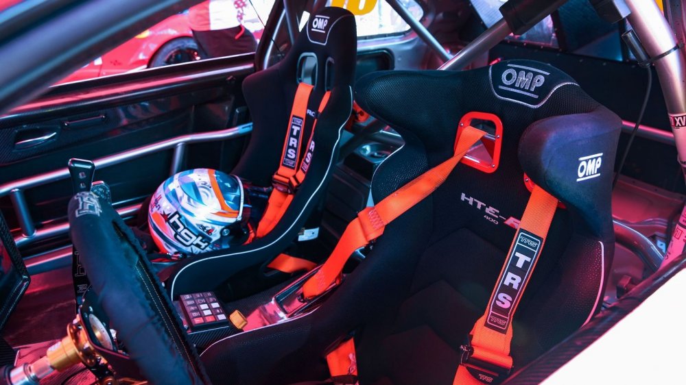 Интерьер машины ожидаемо аскетичен и максимально функционален. Хотя не обошлось и без толики «спортивной роскоши»: карбоновый комплект доработки включает в себя не только кузовные детали из карбона, но и элементы интерьера, включая переднюю панель, дверные карты и так далее. В остальном же это типичный гоночный автомобиль: ковши и руль от OMP, ремни безопасности TRS. Каркас безопасности изготовлен самостоятельно компанией HGK.