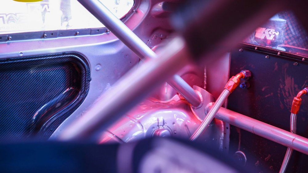Фирменные «ноздри» BMW здесь играют максимально функциональную роль: они собирают воздух в карбоновый впуск от HGK, который гонит воздух к здоровенной дроссельной заслонке диаметром 125 мм. Система охлаждения – тоже разработки HGK и построена по вполне привычной для таких машин схеме, когда большой радиатор с вентиляторами для улучшения развесовки расположен в багажнике. Здесь же находится и топливный бак со встроенным насосом, а также радиатор для охлаждения топлива – это важно, поскольку на некоторых летних этапах дрифт-серии температура достигает 40 градусов. ЭБУ выбран от MoTeC из соображений популярности этой компании: вне зависимости от страны проведения гонки при необходимости можно найти специалиста по настройке.