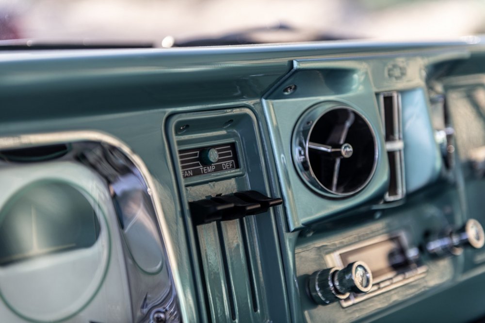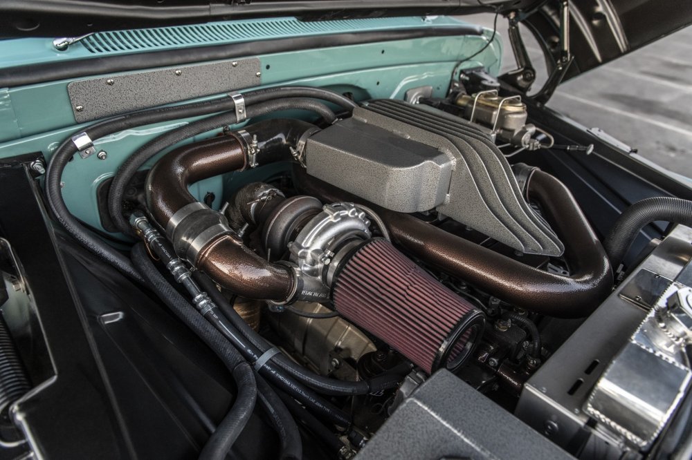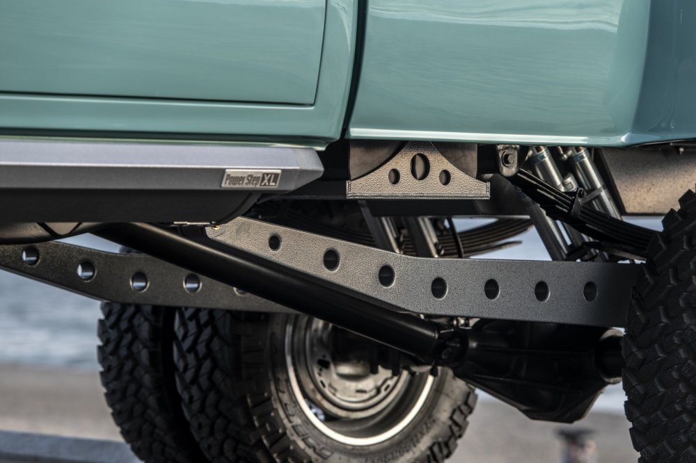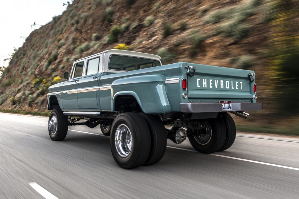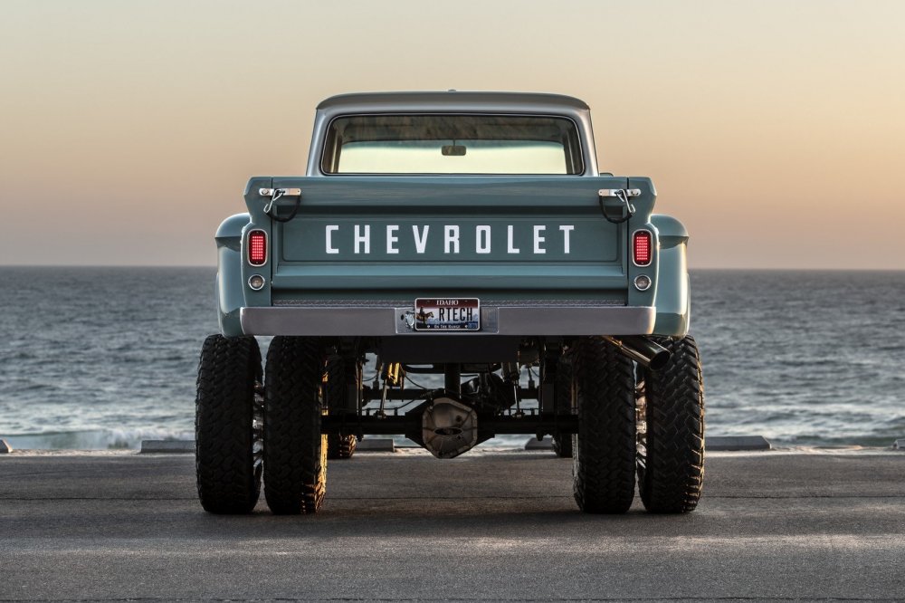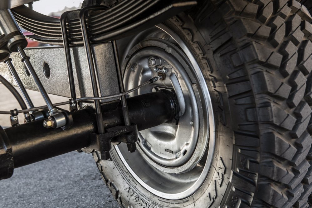 Кузов и двойная кабина взяты от модели 1966 года и поставлены на более позднюю раму 1972 года, к которой прикручена новая лифтованная подвеска – разумеется рессорная (от Skyjacker), но со сдвоенными амортизаторами Bilstein и внешними резервуарами «по кругу», недвусмысленно намекающими на то, что этот старый Chevy готов прыгать по песчаным дюнам не хуже современного Форда F-150 Raptor. Новые карданные валы, полуоси, главные пары и рулевое управление, разумеется, выбраны с расчётом на повышенную нагрузку. 20-дюймовые полированные олдскульные колёса обуты в современные 37-дюймовые внедорожные шины Nitto Trail Grapplers. Под кузовом установлен огромный 227-литровый топливный бак.