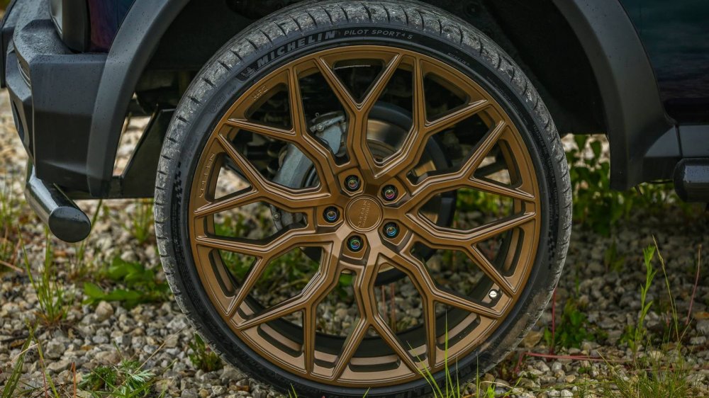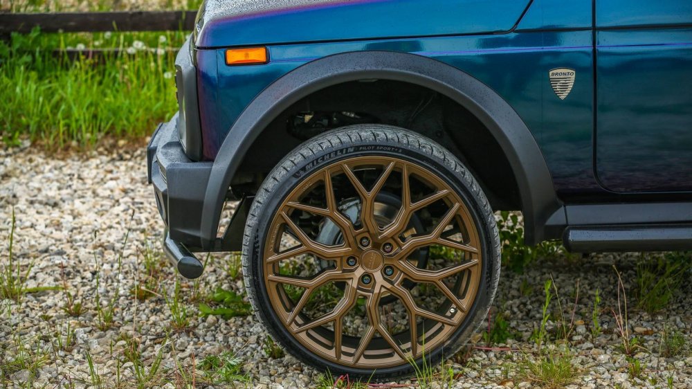 Ну а потом – пошло-поехало: остатки заводской оптики, которая мрачно выглядела и слабо светила, тоже заменили на лучшее из магазина тюнинговых запчастей для Lada. Щепотью перца же стали оригинальные 22-дюймовые диски Vossen HF-2 в цвете Satin Bronze, которые стоят больше половины самой машины. Обуты они в шины Michelin Pilot Sport 4 тридцатого профиля, рассчитанные на такие скорости, которых Нива может достичь только в свободном падении. Но ведь качество – это тоже часть стиля.