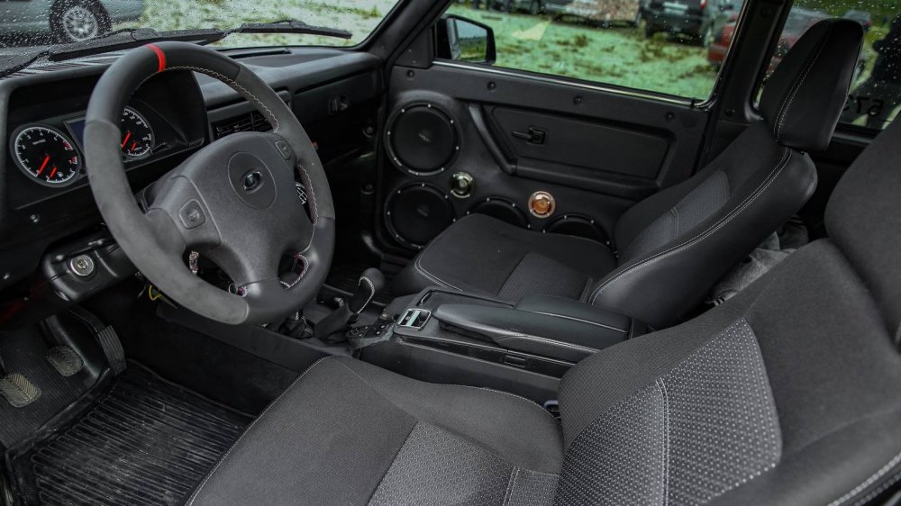 В заводском салоне Lada 4×4 Bronto все… хорошо. Ну, почти все – кроме музыки, потому что ее здесь просто-напросто нет, а та, что предлагается в качестве опции, своих денег совершенно не стоит. Поэтому не стоит удивляться, что музыка в машине появилась даже раньше новых колес, пленки и оптики.