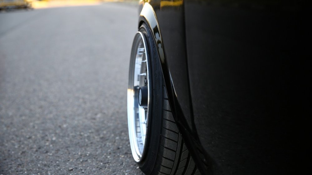 Стойки сделаны на заказ: они дают занижение в 140 мм. И да, здесь применены именно обычные короткие стойки, подвеска собрана без «винтов». Развал теперь составляет минус 6 градусов на передней оси и минус 7 градусов на задней. Финальные работы по подвеске включали в себя выставление хорошего фитмента (положения колеса относительно арки).