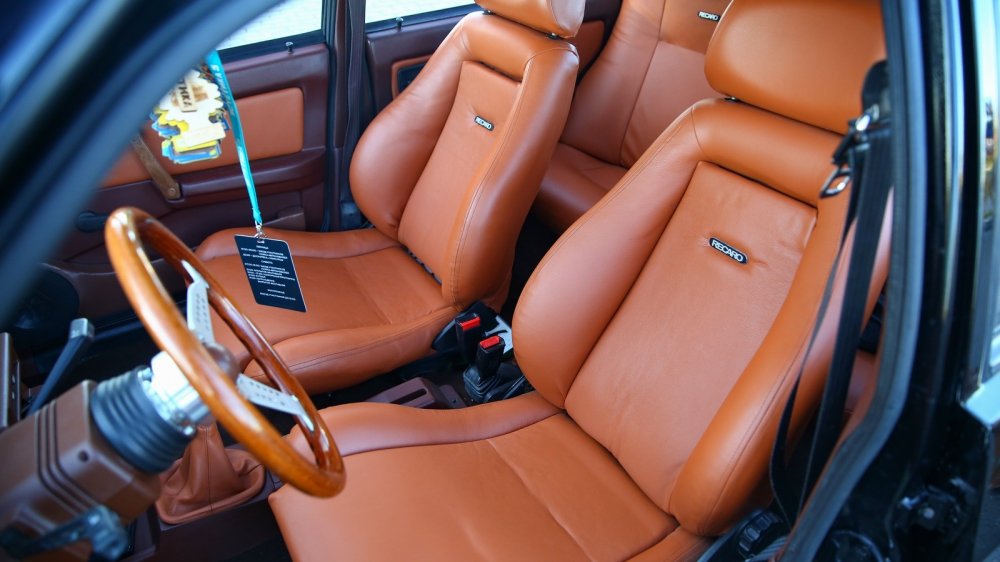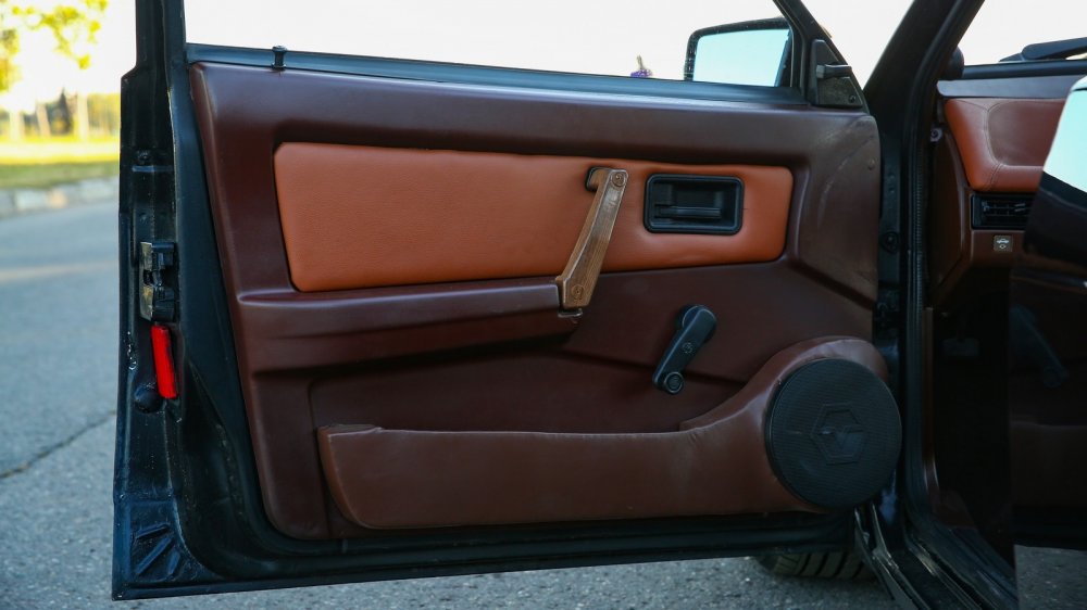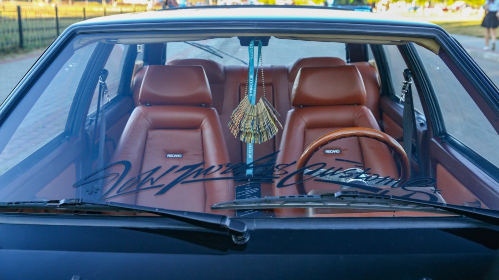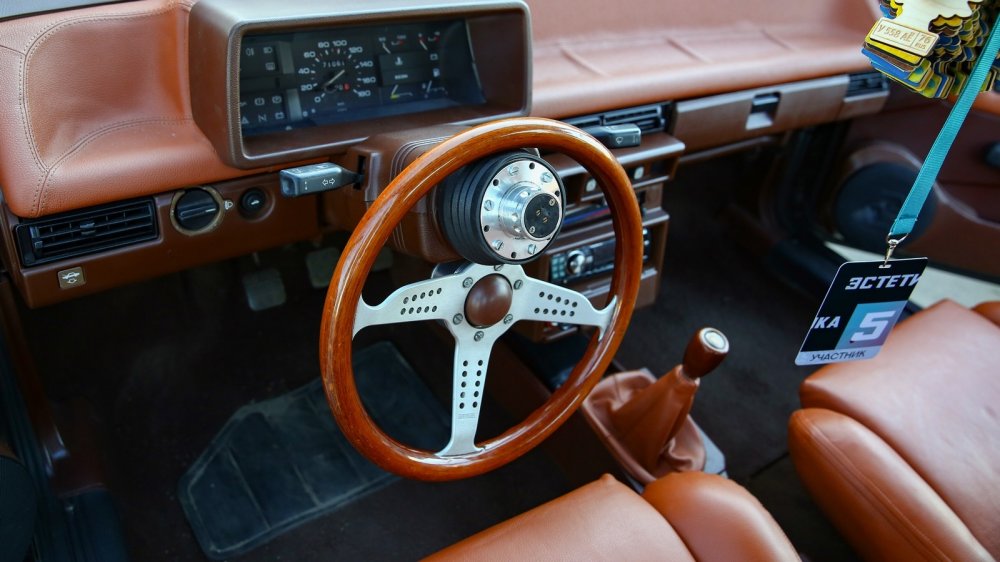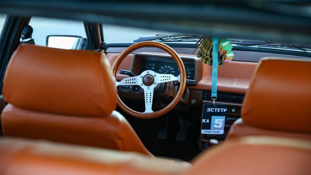 На эту «основу» Алексей начал добавлять как новые элементы, так и старые, но получившие новое воплощение. К примеру, спереди появились полуковши Recaro, а задний диван позаимствован от Honda. Все это перешито в кожу – как и накладка торпедо, и вставки в карты дверей. В потолке установлены дилерские часы. Деревянные акценты включают в себя руль Momo Futura, быстросъемный японский переходник для руля, деревянную ручку рычага КП Porsche и особенный фетиш Алексея – специально изготовленные деревянные ручки открывания дверей и насадку на ручник. Из не бросающегося в глаза можно отметить солнцезащитные козырьки с зеркалами и подсветкой от Мерседеса Е-класса. Как мы помним, идеей было собрать автомобиль на родных запчастях и дилерских допах, но эти козырьки оказались практически полностью аналогичны стоку по форме и размеру – пришлось только сделать проводку и новые крепления.
