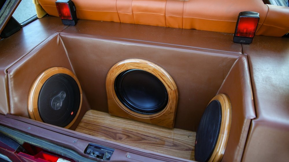 Багажник, разумеется, не остался пустым: здесь собрана вполне типовая инсталляция – пара больших трехполосных динамиков, сабвуфер и пара усилителей, а также фальшпол из ламината.