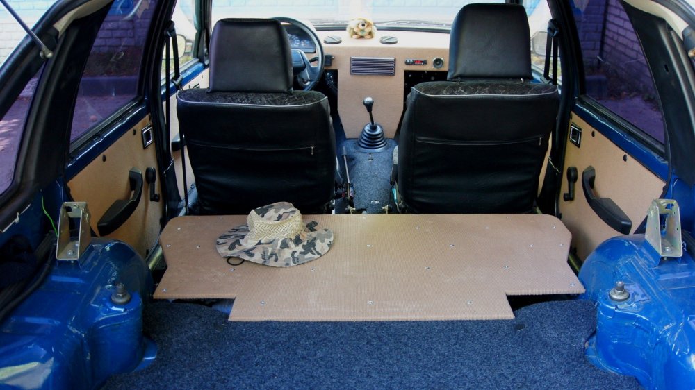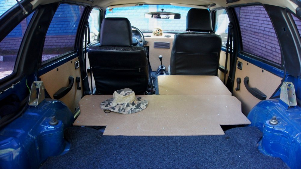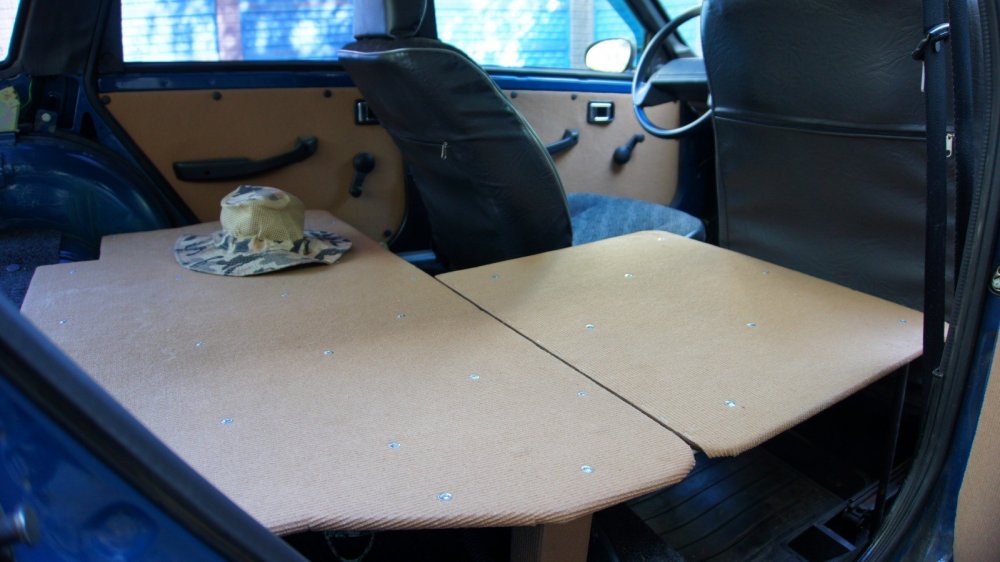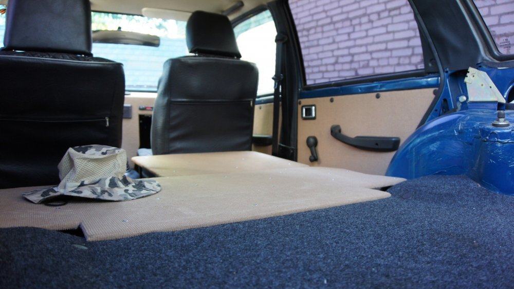 Серьезным “колхозингом” охвачен и задний ряд сидений. Собственно, и само сиденье, и его спинка были также сняты и выброшены. Вместо них появился ровный пол из фанеры – заподлицо с полом багажника. Машина стала фактически двухместной. Целью такой компромиссной переделки было формирование полноценного спального лежбища, необходимого при поездках на охоту и рыбалку.