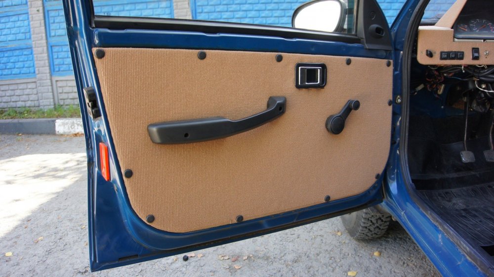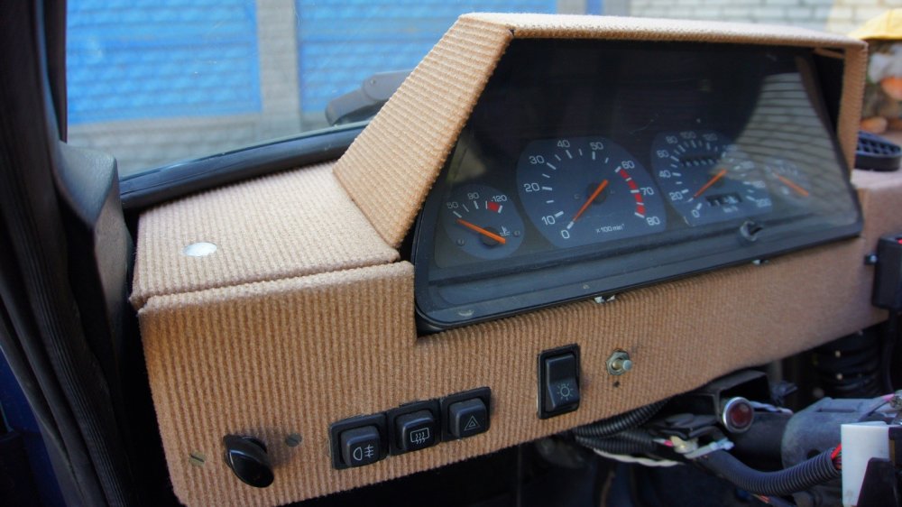 Доводить до ума изначально убогую конструкцию желания не было, поэтому торпедо Ижа, тоннели пола, обшивки дверей, обшивки задних арок из багажника и прочий декоративный пластик владелец просто снял целиком и вынес на мусорку за пару заходов. Взамен было изготовлено новое «торпедо» из фанеры, затем обтянутое «веселеньким ситчиком» – в смысле, светленьким ковролинчиком. То же самое было проделано и с дверьми.