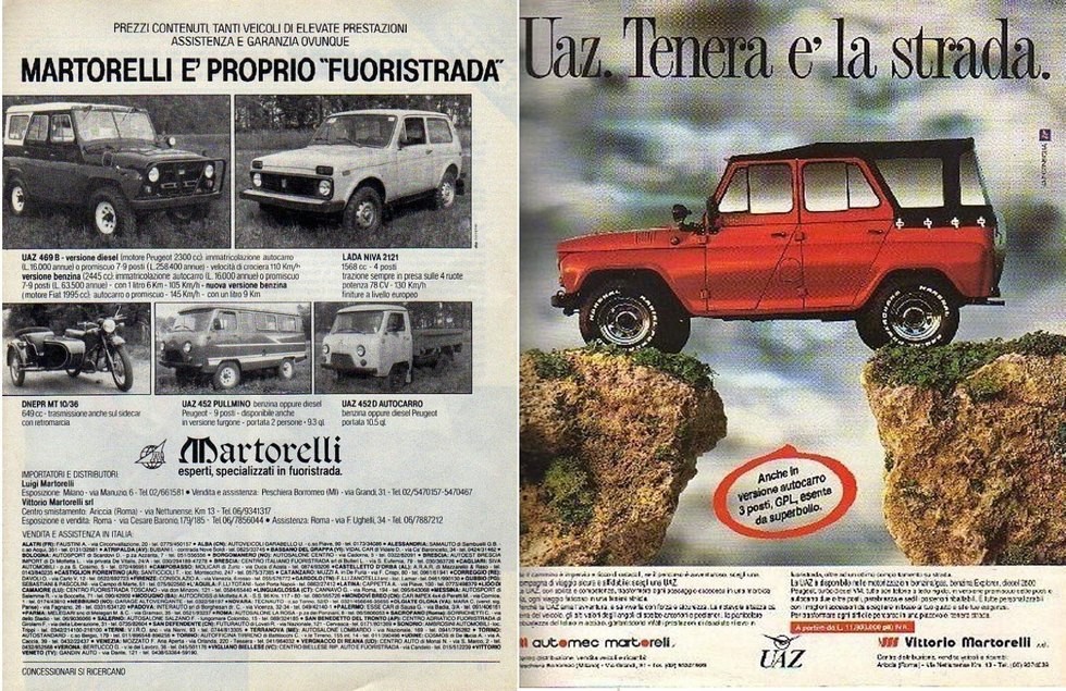 Забавный факт: в 1916 году бизнесмен Фернандо Марторелли начал продавать в Италии роскошные автомобили марки Rolls-Royce, а спустя шесть десятилетий его внуки Витторио, Луиджи и Филиппо стали официально представлять у себя на родине советские внедорожники!