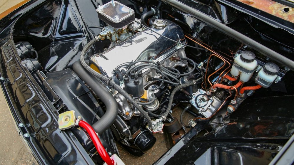 А вот вид подкапотного пространства подвергся серьезным изменениям. В 2015 году, в зимний период, свободный от посещения выставок и мероприятий, был выполнен шейвинг подкапотного пространства: лишние отверстия заварены и зашпатлеваны, металл выкрашен в черный цвет, убраны жгуты проводки агрегатов, реле и силовые провода. Аккумуляторная батарея переехала в багажное отделение. Некоторые детали – корпус воздушного фильтра и клапанная крышка – были заменены на хромированные, а некоторые пробно покрыты никелем, который в конечном итоге тоже уступил место хрому. Единственный «нестандартный» агрегат – пятиступенчатая коробка передач от ВАЗ-2107, установку которой навязала регулярная эксплуатация.