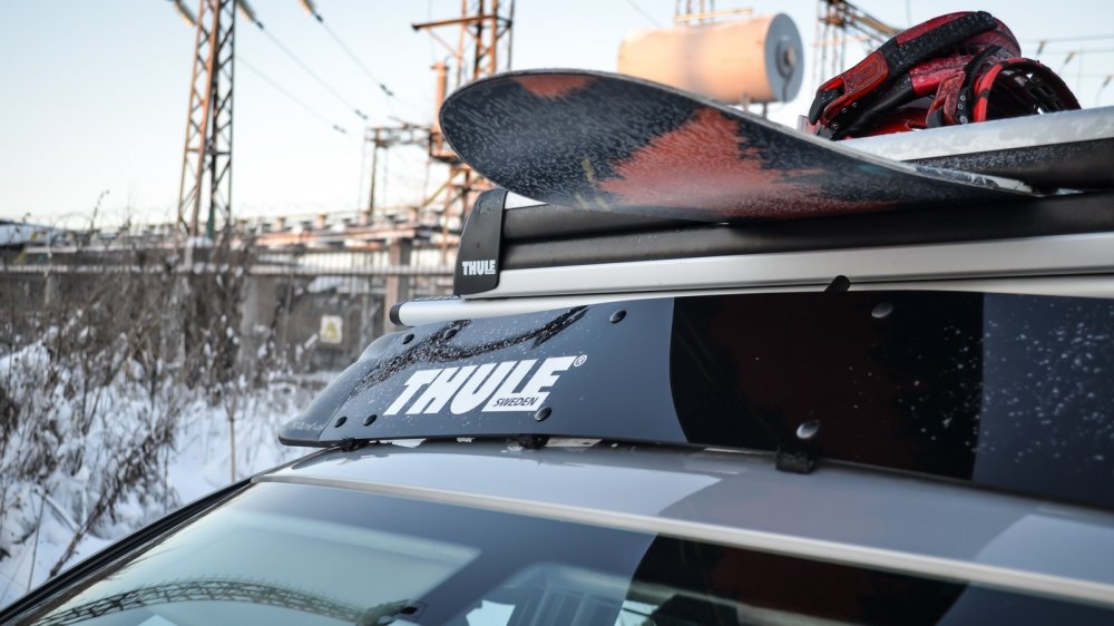Андрей часто путешествует по России и увлекается сноубордом, так что он поставил на крышу аэродинамический багажник Thule WingBar с крепежом под два сноуборда, а в путешествиях его сменяет топовая «корзина» Thule Xpedition 821 (99x158 см). Позже для лучшей аэродинамики к этому набору добавили обтекатель Thule Fairling.
