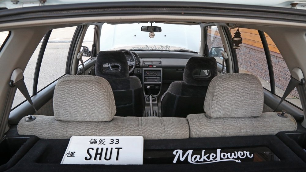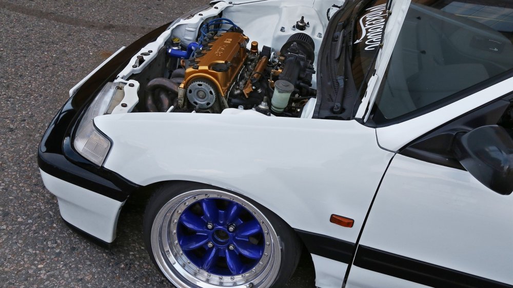 По причине больших затрат мощности и момента на раскрутку задних колес и постоянного выхода из строя задних гранат при езде на разноразмерном комплекте дисков и шин (а оные были просто необходимы для красоты и стиля), Саша решил избавиться от полного привода и приобрел коробку передач от Сивика пятого поколения. С установкой особых проблем не возникло — потребовалось чуть доработать подушки КПП, вместо тросика сцепления пустить гидролинию, переделать педальный узел с внедрением главного цилиндра сцепления и доработать тяги переключения передач. Затем Александр в очередной раз переплел и переложил моторную проводку и кропотливо проделал еще кучу мелочей, чтобы все выглядело так, как вы видите сейчас.