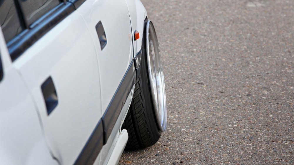 Завершают облик автомобиля потрясающие Panasport Racing G7. Когда-то они были куплены в параметрах 15х6. Позже на заводе в Германии были на заказ изготовлены более широкие внешние обода шириной 2,5" спереди и 4,5" сзади. Саша собрал диски шириной 8" спереди и 10" сзади, а перед сезоном 2016 купил диски-доноры, отрезал с них внутренние обода и наварил на свои. За счет этого диски были расширены еще на 1" вкруг, и в данный момент на Шаттле стоят колеса с параметрами 15х9 спереди и 15х11 сзади. И выглядит это — соответствующе!