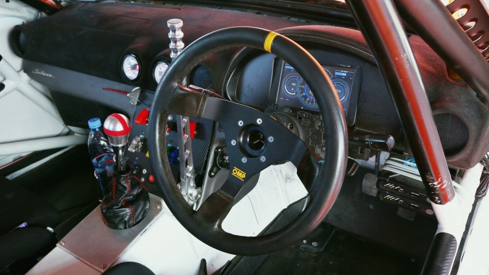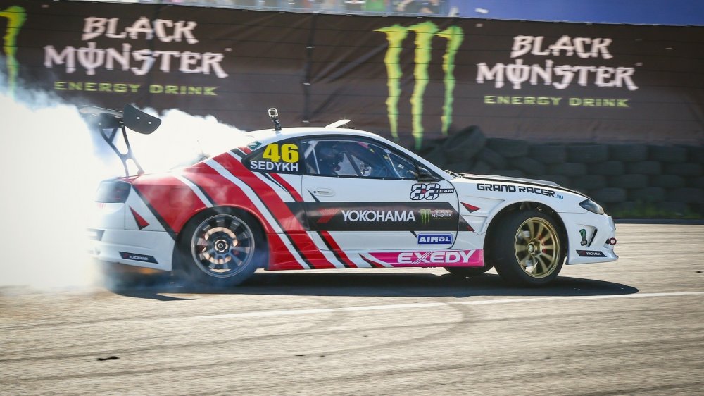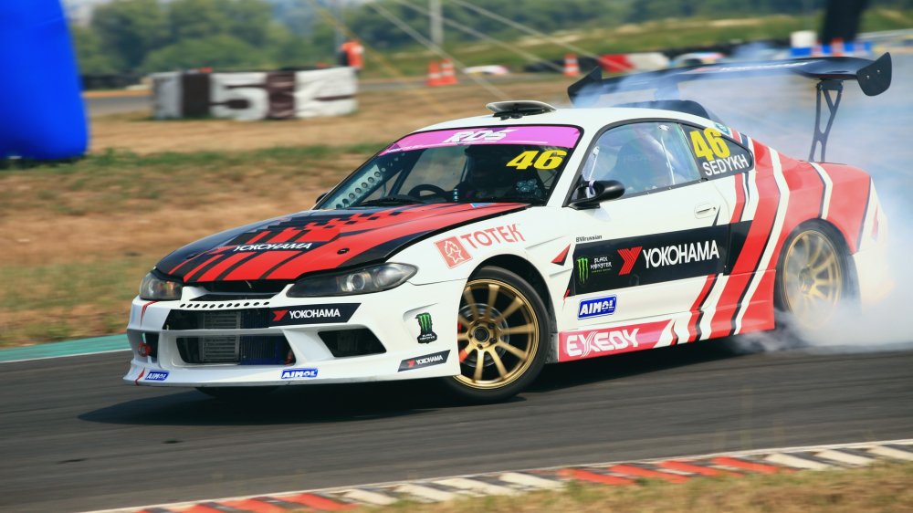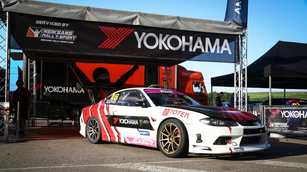 Кузов Катиной Сильвии выглядит лаконично – тонкий женский вкус, как-никак. Все навесные панели (бамперы, крылья, пороги, двери, крышка багажника, капот) – пластиковые, облегченные. За передним и задним бамперами из комплекта обвеса Vertex Edge скрываются кастомные баш-бары – эдакие «кенгурятники», позволяющие защитить все жизненно важные элементы болида при контактах, которые случаются в дрифте довольно часто. Над крышкой багажника возвышается огромный карбоновый спойлер, а расцветка в цветах команды Yokohama с ярким сочетанием красного и белого выделяет автомобиль на трассе.