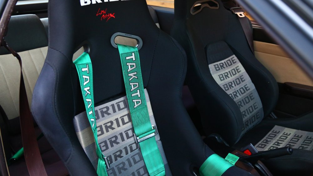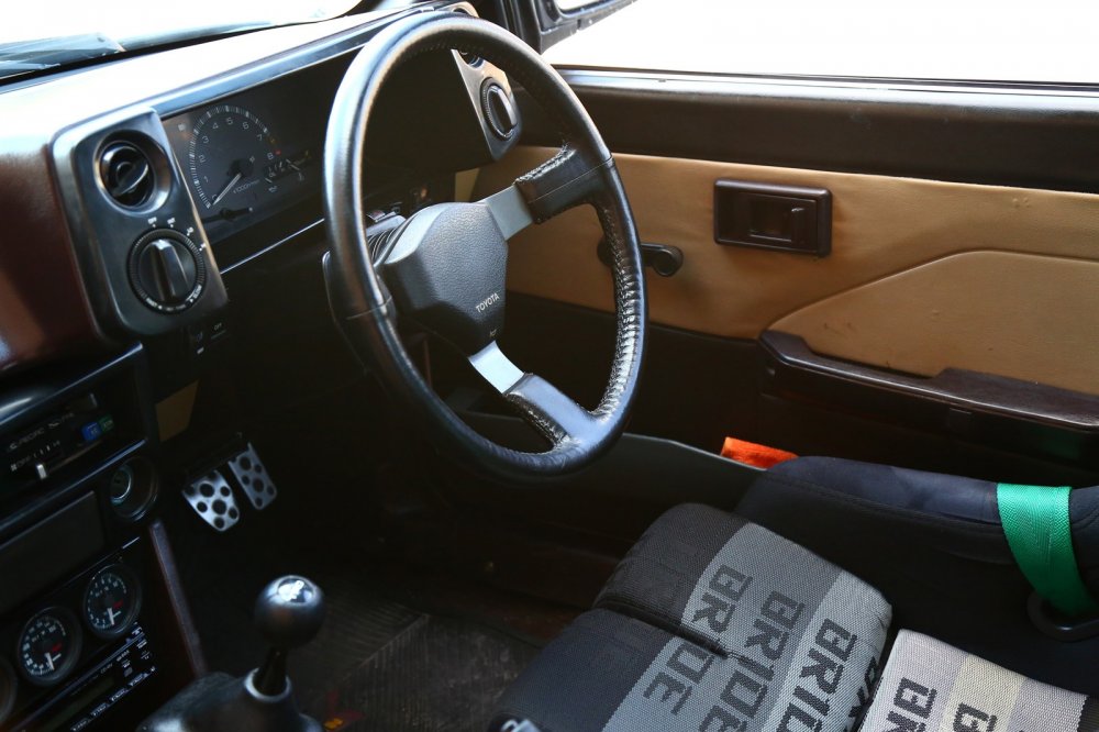 Салон автомобиля остался практически в стоковом виде – за исключением уже упомянутой панели приборов от АЕ86, водительского ковша Bride Vios с оригинальными салазками Bride специально для AE86, пассажирского сиденья Bride Ergo II и водительских ремней безопасности фирмы Takata.