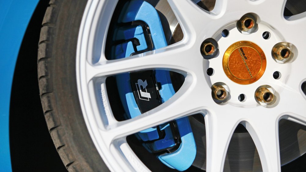 Теперь в задние арки можно запросто поместить колеса с куда более «злыми» параметрами – но полный привод подразумевает установку одинаковых «тапок» спереди и сзади. Поэтому оставили тот же комплект 17-дюймовых дисков BBS, но перебрали их с заменой полок, благо конструкция трехсоставная и позволяет это сделать. Под капот внедрили распорку между чашками стоек – и для жесткости, и для эстетики.