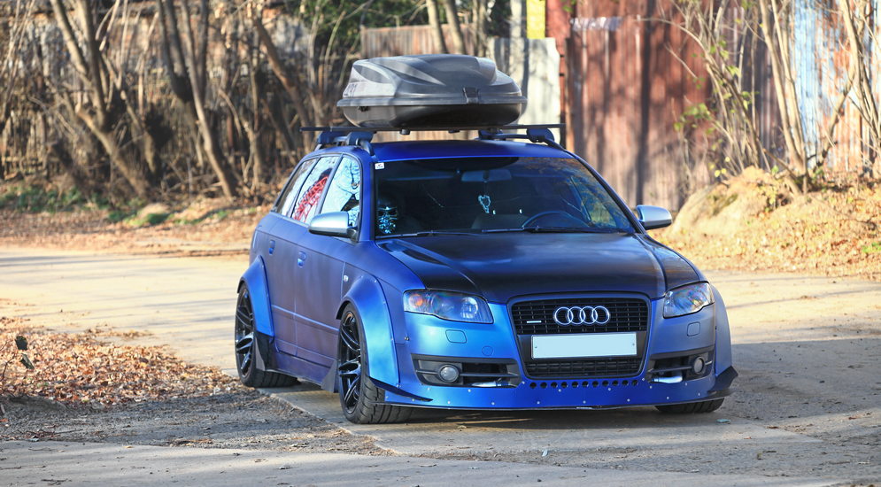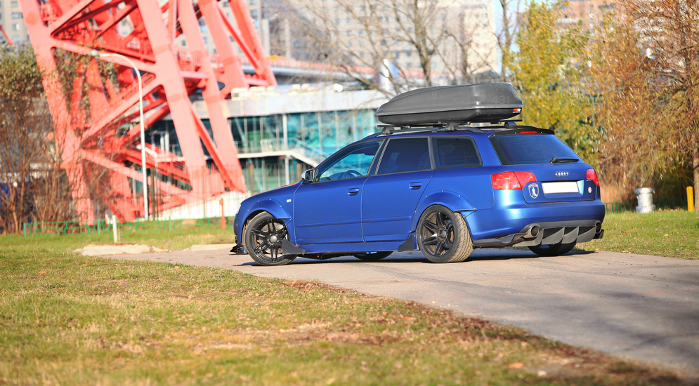 Однако на этом история преображения образа Audi A4 Avant не закончилась. Артем добавил – никогда не угадаете что – багажник на крышу! Желание заиметь такой девайс зародилось, когда владельцу машины крайне надоело слушать посторонние звуки, доносящиеся из штатного багажника. Когда «вваливаешь» по дороге, в нем вечно что-то да летает туда-сюда, словно шар по бильярдному столу – то пакет, то сумка, то щетка для чистки стекол. Так что в один прекрасный момент Артем не выдержал и поставил этого монстра на крышу: теперь проблема с летающими предметами полностью на его совести, зато в салоне – о чудо – тишина.