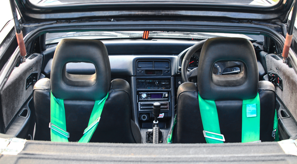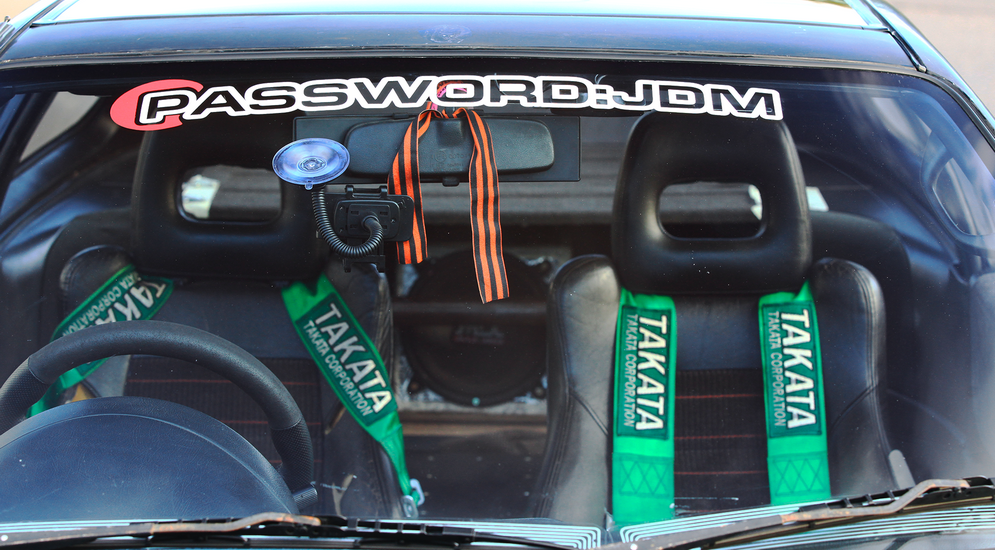 Машина ни разу не была (и не будет) в сервисе: все работы Миша делает сам. Да-да, абсолютно все – от переборки двигателя и до «каждую железочку нужно снять, очистить от ржавчины до блеска и покрасить, иначе не по фэн-шую». В салоне Михаил расположил кастомную распорку задних стоек с интегрированными креплениями для трехдюймовых четырехточечных ремней безопасности Takata. Еще из интересного – кнопка открытия багажника: система представляет собой симбиоз из распиленного болгаркой брелока от сигнализации, запакованного в кусок резинового шланга, реле и актуатора от сигнализации.
