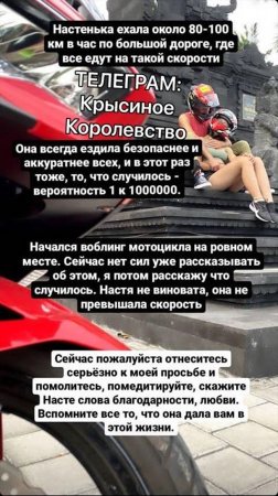 "Начался вобблинг (возникновение быстрых колебаний переднего колеса, - ред.) мотоцикла на ровном месте… Настя не виновата. Она не превышала скорость. То, что случилось, — вероятность 1 к 1 000 000", - сообщил молодой человек.