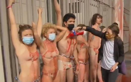 Активисты экологического движения разделись до белья и приковали себя цепью к ограде Министерства экономики Франции.