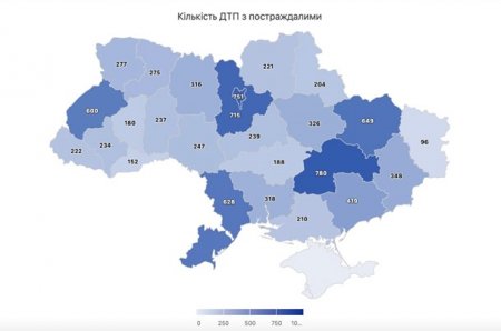 Самые большое количество ДТП с пострадавшими произошло в Днепропетровской области (780), в Киеве и Киевской области (715 и 751 соответственно), а также в Харьковской (649) и Одесской (628) областях.