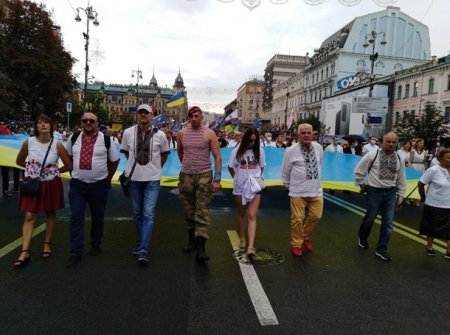 В Киеве прошел Марш защитников и состоялась церемония поднятия самого большого в стране флага Украины.