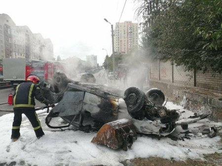 В Киеве опрокинулся и загорелся автомобиль