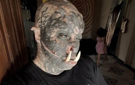 Покрытый тату мужчина с двойным языком нарастил клыки