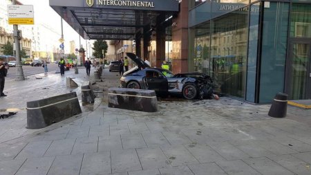 На Тверской улице в Москве утром 9 августа столкнулись два Mercedes. От удара один из автомобилей вылетел на полосу встречного движения, а потом выехал на тротуар и врезался в гостиницу InterContinental.
