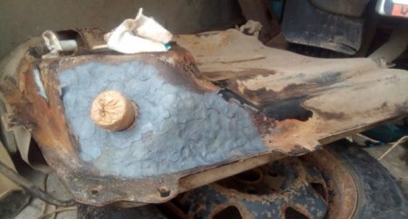 Холодная сварка и наждачка. Самый простой способ ремонта топливного бака. Рабочая зона зачищается наждачкой, холодная сварка разогревается и разминается в руках. После этого следует заделать пробоину, размазывая материал по поверхности бака. Как только состав высохнет, его можно будет обработать краской.