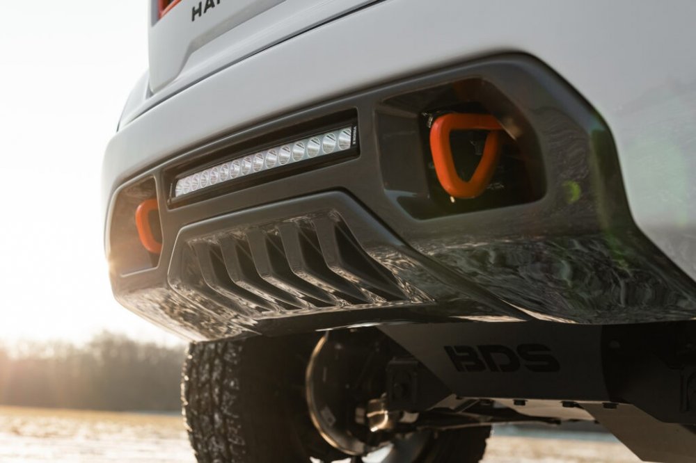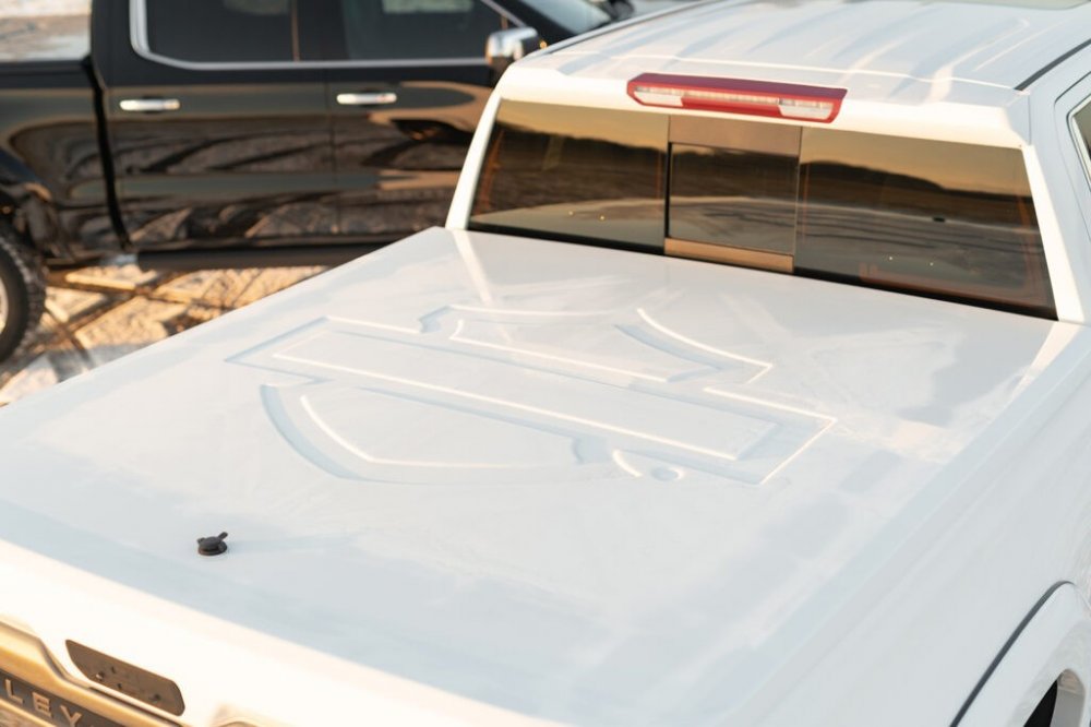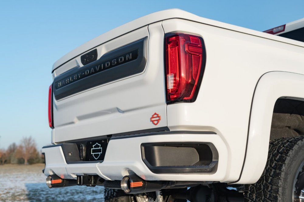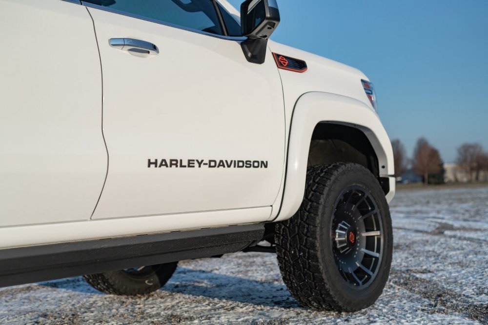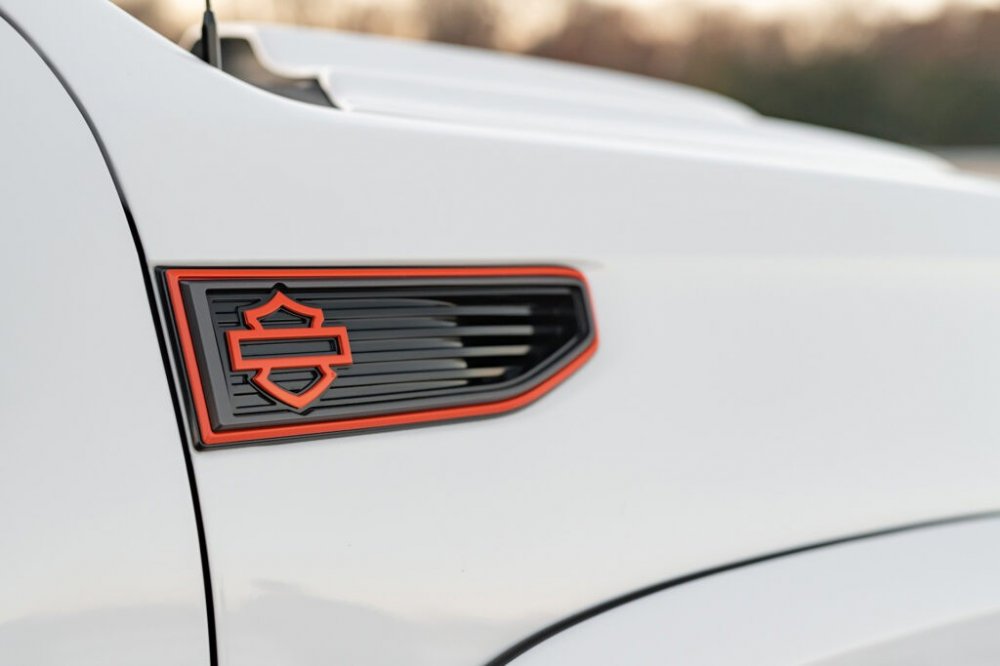 За что же берут лишние 20 тысяч в исполнении Harley-Davidson? В первую очередь за эксклюзивность: пикап снаружи и внутри увешан логотипами мотоциклетной марки, и в целом имеет 65 уникальных деталей. В частности у него лифтованная подвеска от BDS и амортизаторы Fox, 22-дюймовые фрезерованные колёса Harley-Davidson в стиле культового тяжёлого круизёра Fat Boy, выдвижные боковые подножки с электроприводом и подсветкой, оригинальный задний бампер с врезанными в него выхлопными патрубками из цельных кусков алюминия, оригинальный передний бампер со светодиодными огнями, новая фальшрадиаторная решётка в стиле Harley-Davidson, оригинальный капот с воздухозаборником, оранжевые буксировочные крюки спереди и сзади, оригинальная отделка грузового отсека и крышка для него с большой рельефной эмблемой Harley-Davidson. Доступно всего два цвета кабины и кузова на выбор – Onyx Black и Summit White.