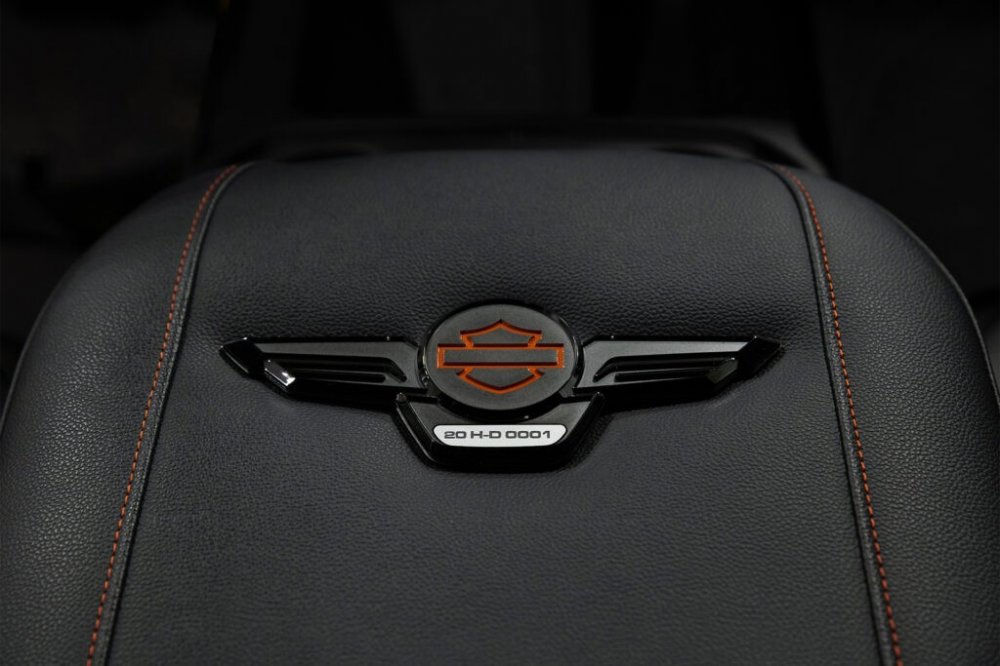 В салоне – оригинальная кожаная обивка кресел с оранжевой прострочкой, вещевой бокс между передними креслами с крупной литой эмблемой Harley-Davidson, вставки из чёрного глянцевого пластика, брендированные коврики и накладки на порогах, брендированные накладки на педалях, оригинальный щиток приборов с оранжевой подсветкой.