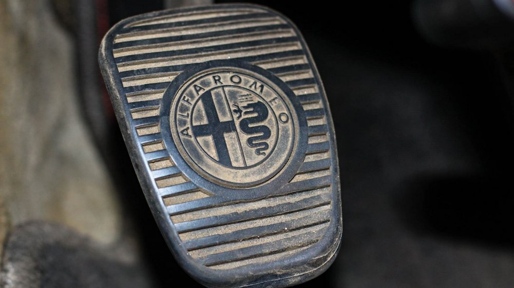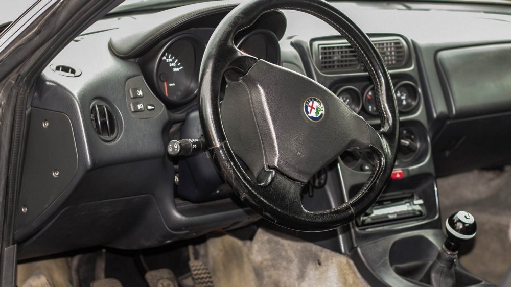 Салон собран из неплохих материалов и с лёгкой итальянской небрежностью, допускающей наличие неравномерных зазоров. Накал страстей по сравнению с экстерьером на порядок ниже, но интересных деталей хватает. Козырёк приборки с печально висящими вниз красными стрелками обшит добротным кожзамом. С центральной консоли на водителя внимательно смотрит повернутая в его сторону троица дополнительных приборов. Альфовским гербом украшены педали и спинки обитых кожей спортивных сидений.