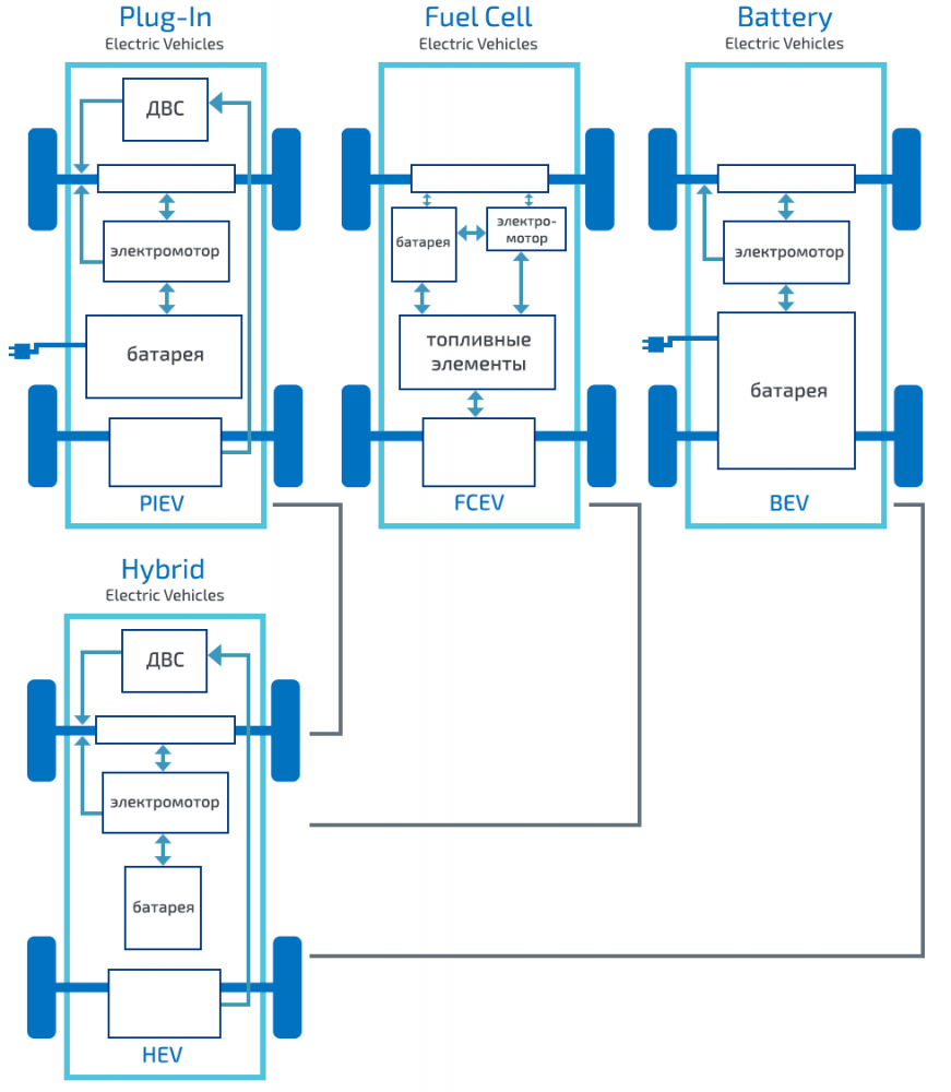 Т.П.: Нет (смеется). Эта тема – одно из направлений наших гибридных технологий. Ведь гибрид – это платформа, которая позволяет разрабатывать различные вариации. Взгляните на эту схему, ей уже более 20 лет. Вот гибридная система с ДВС, электромотором, батареей и инвертором. Но она дает различные производные. К примеру, если мы заменим ДВС на схему с топливными элементами, то у нас получится гибрид на топливных элементах. Если мы заменим ДВС на большую батарею, то получится BEV – battery electric vehicle, то есть, электромобиль.