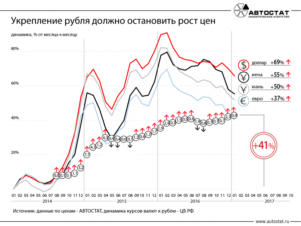 Ринат Утешев: Несмотря на некоторое укрепление курса рубля, резерв для роста цен на новые автомобили по-прежнему сохраняется. Главный аргумент в пользу этого прогноза: цены на автомобили еще не компенсировали снижения курса национальный валюты.