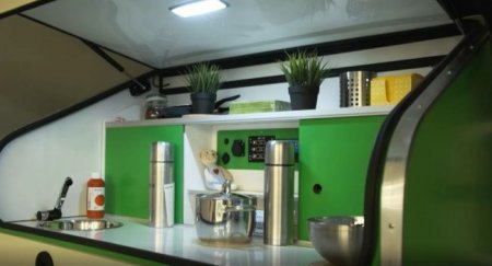 оборудованная кухня, и в спальной зоне матрас, кемпер оснащен