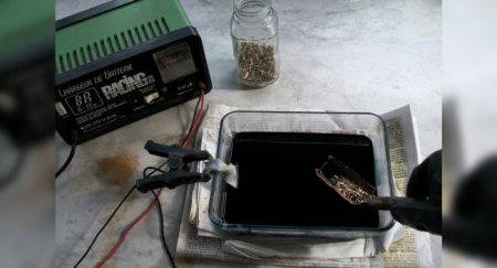 - Приготовленный электролит подогреть до 60 градусов. Деталь в