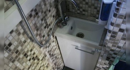 В туалетной комнате компактно разместились умывальник, душ и