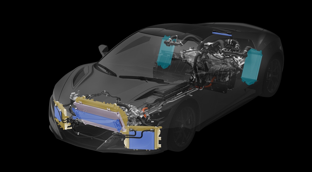 Работая над аэродинамикой суперкара, японцы сосредоточились на том, чтобы достичь максимальной прижимной силы и оптимального охлаждения агрегатов без применения активной аэродинамики. Пыл 3.5-литровой V-образной "шестерки", различных электромоторов и девятискоростной коробки передач DCT остужает десяток радиаторов и теплообменников, разбросанных по всей машине.