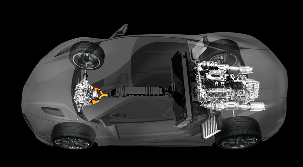 Передние колеса приводятся парой электромоторов, которые по команде управляющего процессора меняют количество передаваемого крутящего момента. Все три электромотора на торможении работают в режиме рекуперации, заряжая батарею.