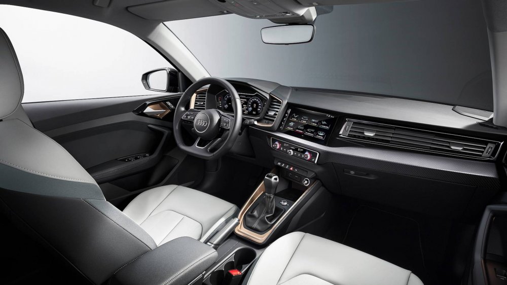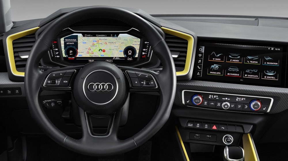 Базовая модель Audi A1 сразу же оснащается виртуальной «приборкой» диагональю 10,25 дюйма, правда, с простым графическим интерфейсом. Фирменный Virtual cockpit с функцией отображения карты навигации предлагается в качестве дополнительной опции. В базе идет обычный радиоприемник с Bluetooth и кнопками управления на рулевом колесе. Информационно-развлекательная система MMI доступна за дополнительную плату в двух вариантах – с экранами диагональю 8,8 и 10,1 дюйма. Система с большим экраном вибрирует при нажатии и умеет читать написанный пальцем текст.