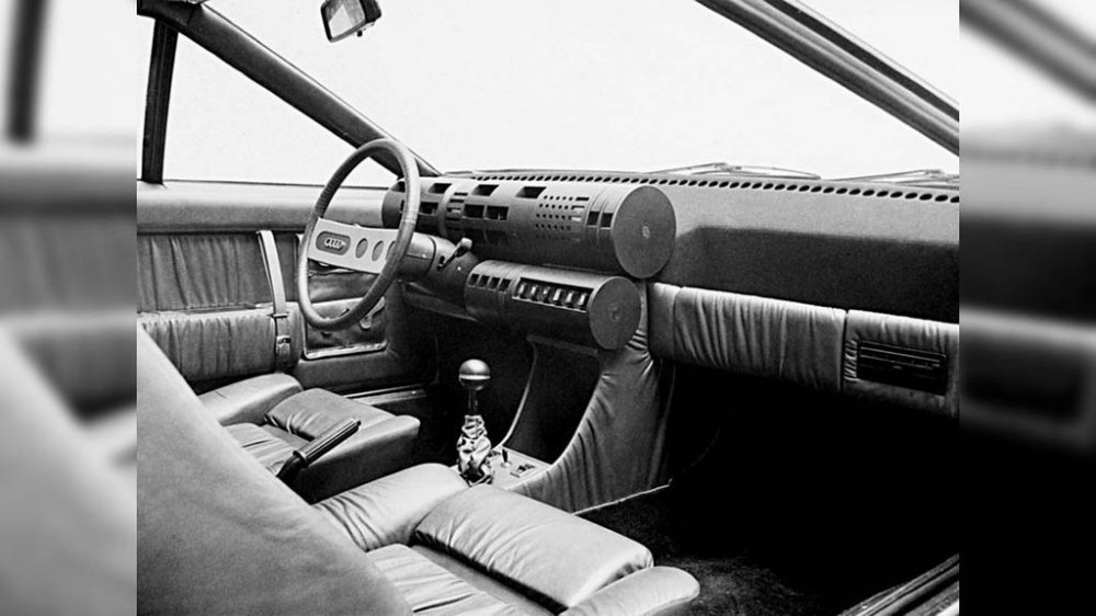 Еще более нетривиально в «Италдизайне» подошли к интерьеру. Так, приборная панель состояла из пары горизонтальных «труб» цилиндрической формы, в которых разместили органы управления и контрольно-измерительные приборы, а крупная баранка имела всего одну горизонтальную спицу.
