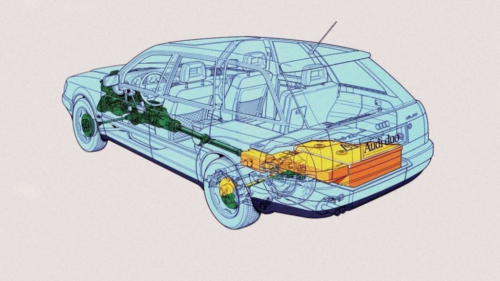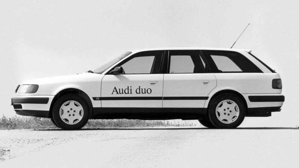Очередной гибрид, но уже на основе «сотки» С4 в Audi создали в 1992 году. Этот универсал Audi Duo оснастили трёхфазным электромотором, вращавшим задние колёса, которые через дифференциал Torsen приводились в движение также и двухлитровым бензиновым ДВС, расположенным в моторном отсеке.