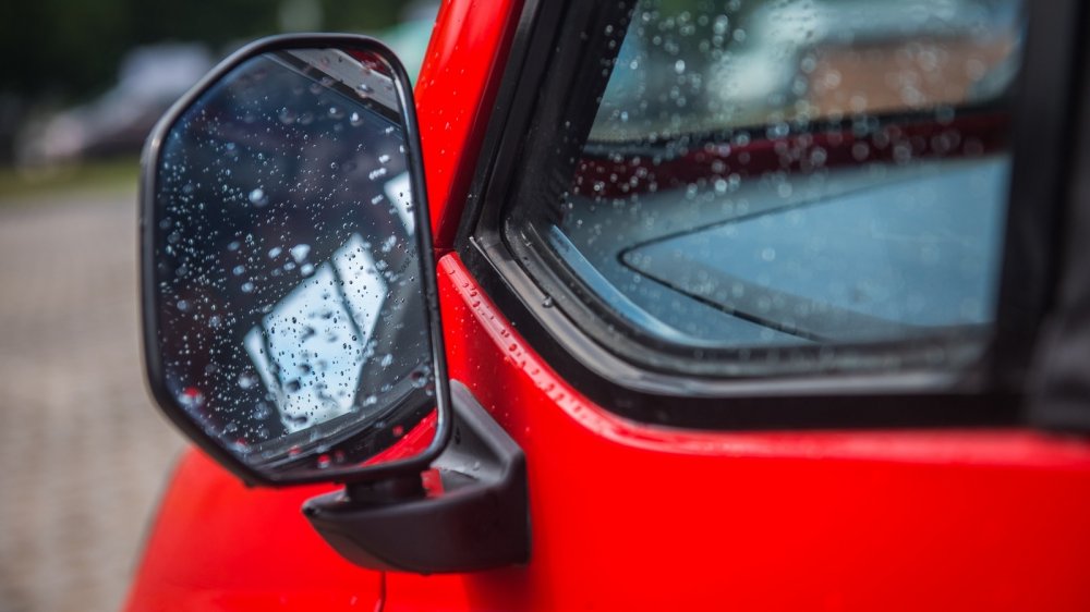 А как оно в салоне? Мы же помним, что окна у нас открыты. Вентиляция – отменная. Хорошо, что на улице жарит! Вот только едва закончившийся ливень делает жизнь не столь радужной. Во-первых, из-под колес соседних машин в лицо летят брызги. Все бы ничего, если можно было бы остановиться и закрыть окна – но они тут же запотеют, влажно ведь! Лобовое стекло тоже потеет, но в базовой комплектации есть обдув лобового, который даже оборудован электроподогревом – дует теплый воздух, так что ехать вслепую не придется. Но малахольного вентилятора, естественно, едва хватает на обдув «лобовухи» – боковые окна остаются матовыми.