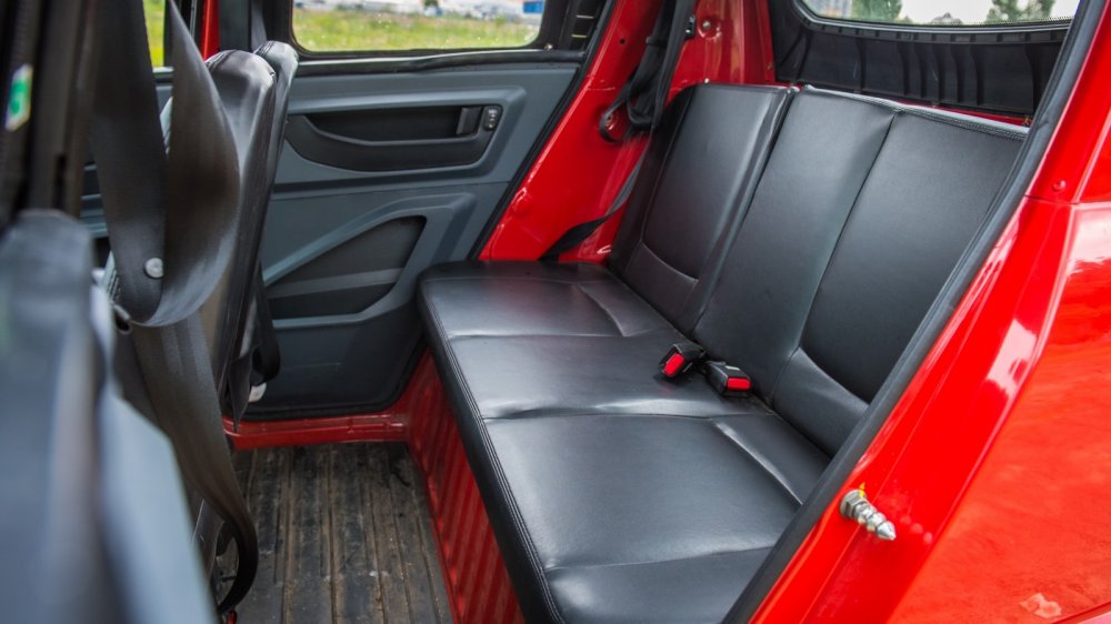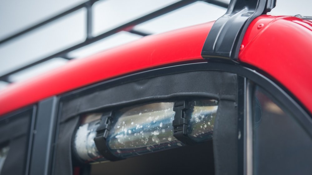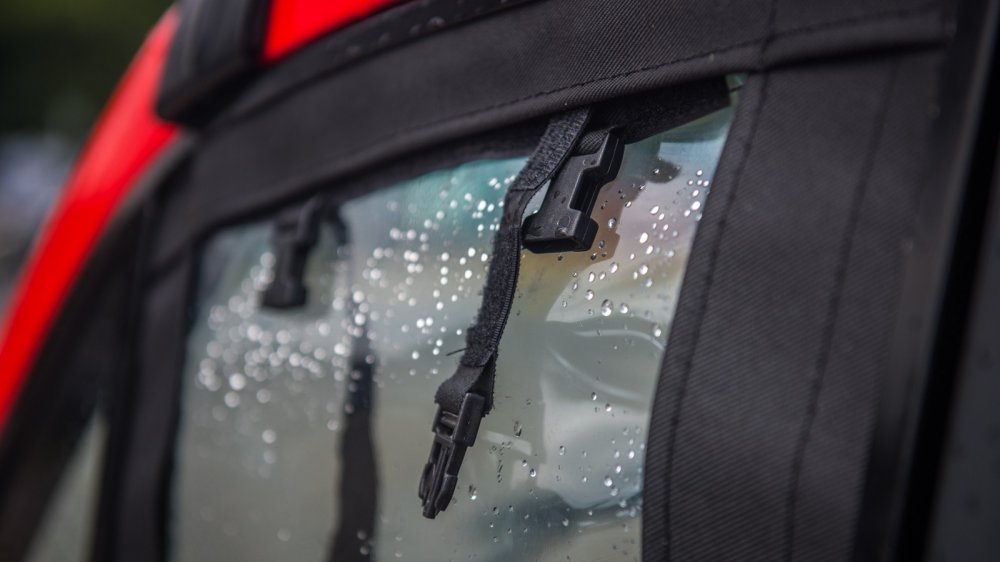 В принципе, снять «занавеску» – проблема невеликая, но если вдруг пойдет дождь, то оперативно «закрыть окно» не получится – придется останавливаться. И еще: это сейчас лето и жара, а что делать осенью? Кстати, ездить с закрытыми «стеклами» тоже не слишком-то комфортно: смотреть сквозь мутноватый пластик – примерно так же, как сквозь мутную воду. В общем, будем надеяться, что обещанный пакет «для российских дорог» будет включать в себя сдвижные «стеклянные стекла», как на УАЗ Хантер.