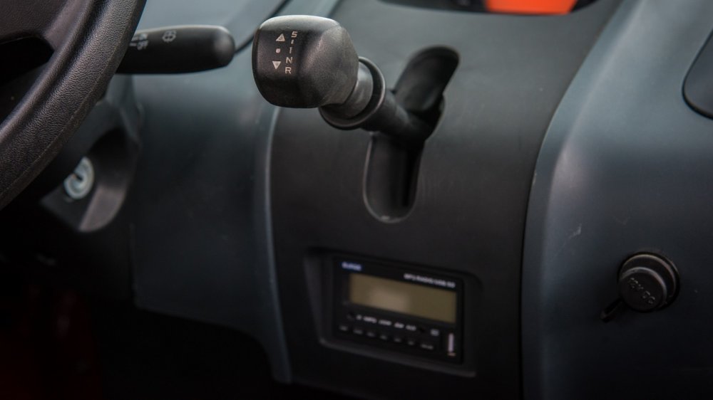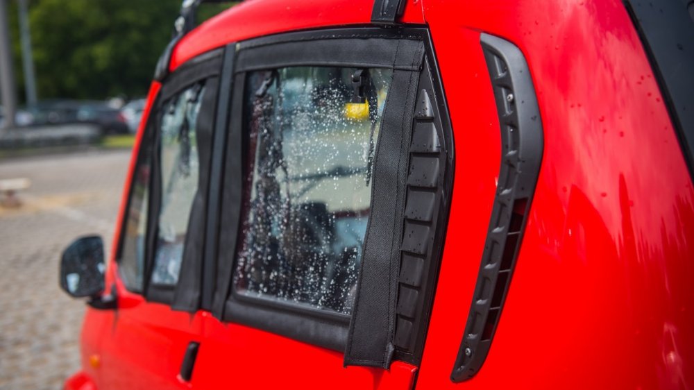 На парковке Кьют смешно втиснут между Ленд Крузером и Хендэ Портером. Выглядит мультяшно, как мышь между двух слоников. Хоть машинка уже знакома, а все равно вызывает улыбку. На улице жарища – прежде чем ехать, расстегиваю две застежки «молнии» и закатываю в трубочку «окно» из мягкого пластика. Повторяю процедуру с пассажирской стороны – и сразу отмечаю первый нюанс: если дальнее окно вопросов не вызывает, то закрепленный в верхней части водительского оконного проема ролик «окна» перегораживает обзор. Крыша у машины хоть и высокая – головой не бьешься – но дверной проем, плюс рамка окна, плюс этот ролик… В общем, необходимо снять его совсем и убрать в дверную нишу – иначе, чтобы посмотреть налево, приходится неестественно сутулиться, заглядывая под него.