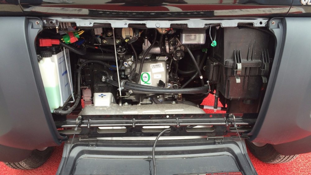 Кстати, коли уж заговорили о багажных емкостях, нельзя не сказать и про главный «багажник». Как и у любой заднемоторной машины, будь то Porsche 911 или Запорожец, он расположен под капотом. Qute – не исключение. Пластиковая крышка также запирается на ключ, а под ней скрывается весьма вместительный рундук. Все, как мы любим, в общем! Разве что запасное колесо здесь хранится не в «подкапотном пространстве», а в ногах у пассажира, внутри салона.