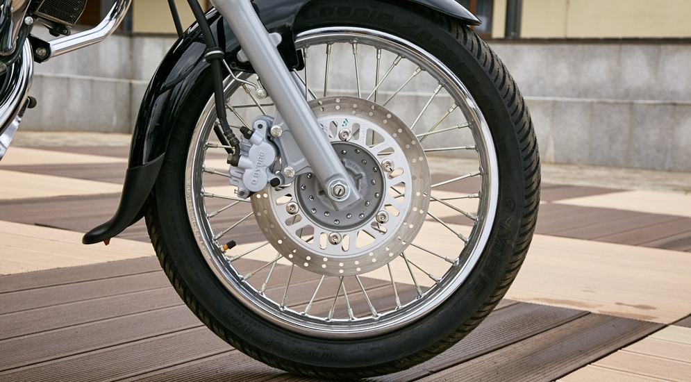 Спереди установлен дисковый тормоз индийского завода Brembo – «Bybre», кстати, эти же механизмы стоят и на всех КТМ индийской сборки. А вот сзади – «привет из прошлого»: барабанный тормоз с механическим приводом. Но не забываем о любви индусов к экономии и о мощности двигателя: официально тут всего 19 сил. Передний тормоз весьма цепок и прогнозируем (все же Brembo, не абы что), а для дотормаживания вполне хватает и заднего барабана – чай, не спортбайк.