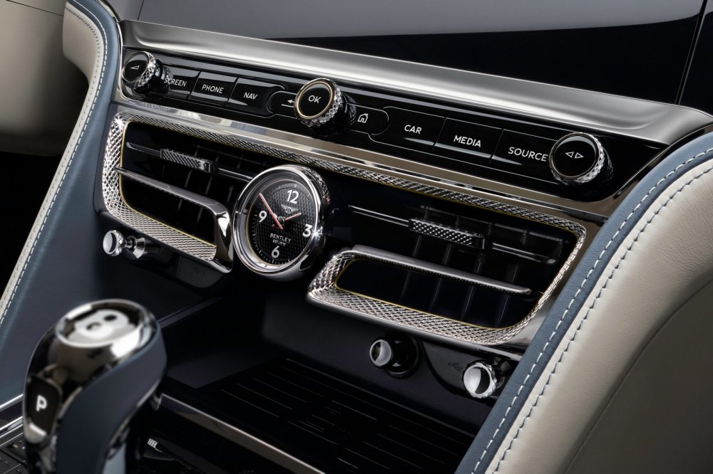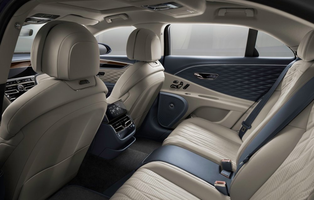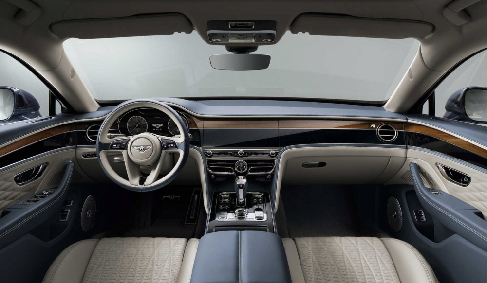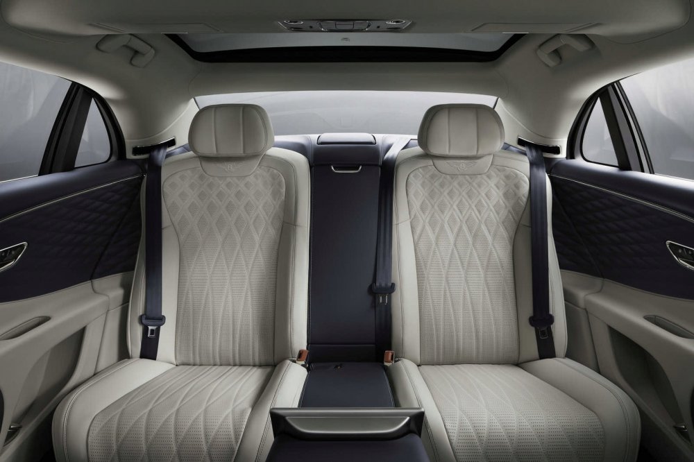 Спереди Flying Spur во многом напоминает соплатформенный Continental GT, но центральные дефлекторы здесь иной формы, с ювелирной окантовкой, а в кожаной обивке применено трёхмерное ромбовидное тиснение.