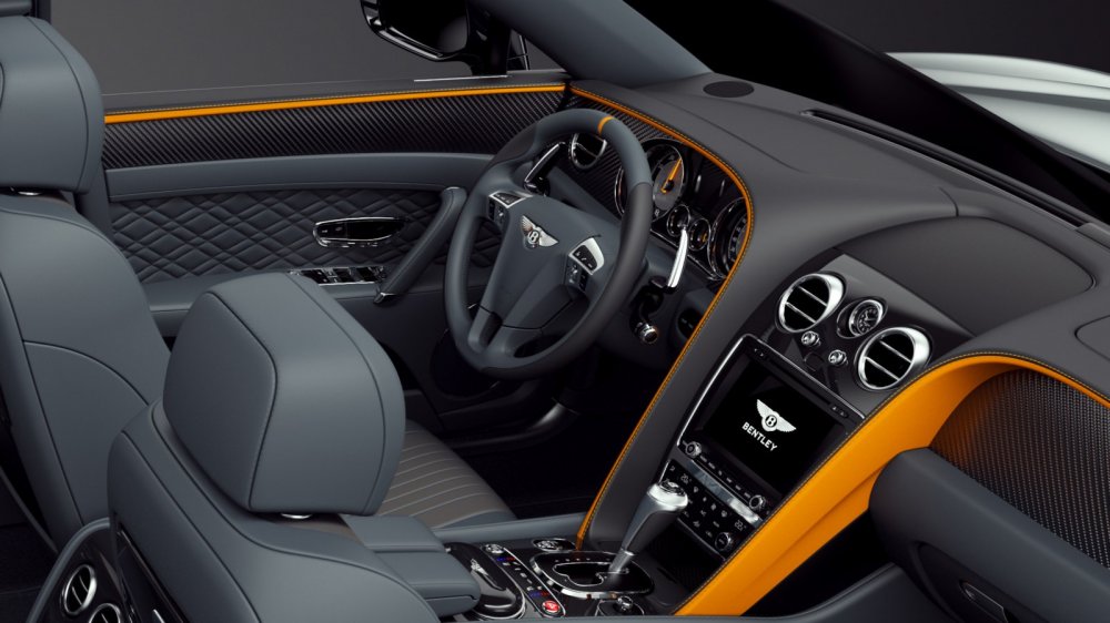 Интерьер новинки оформлялся вручную – под перфорированной кожей верхнего слоя проступает еще один слой в цвет акцентов спецверсии Flying Spur Design Series. На дверных панелях и боковой поддержке кресел выполнена декоративная ромбовидная прострочка. Для оформления использовалась кожа трех уникальных оттенков, а также вставки Piano Black.