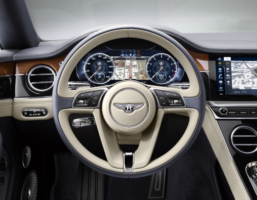 Ещё интереснее сделана центральная консоль. При выключенном зажигании секция мультимедийной системы переворачивается и гармонирует с центральной консолью. Как только запускается мотор, она сразу же переворачивается, и перед водителем появляется сенсорный экран. Также её можно перевернуть ещё раз, и в этом случае будут отображаться три циферблата, на которых выводятся показания хронометра, компаса и температурного датчика за бортом. Помимо всего этого, новый Continental GT получил новые передние сидения с функцией массажа и встроенной вентиляцией, продвинутый климат-контроль, звук Naim или же Bang & Olufsen, а также другие опции.