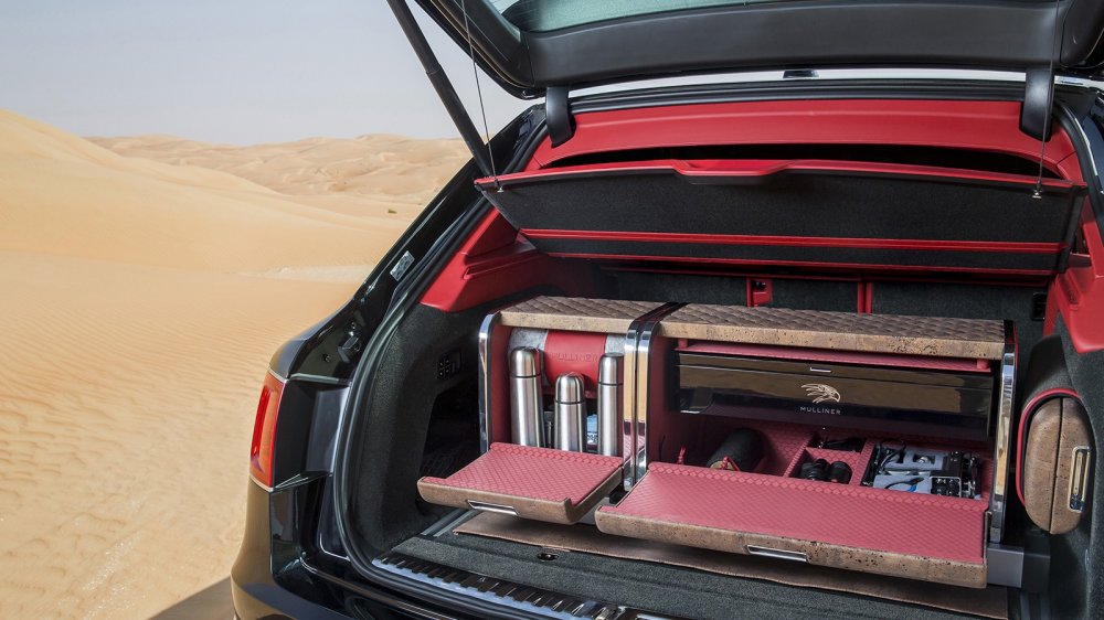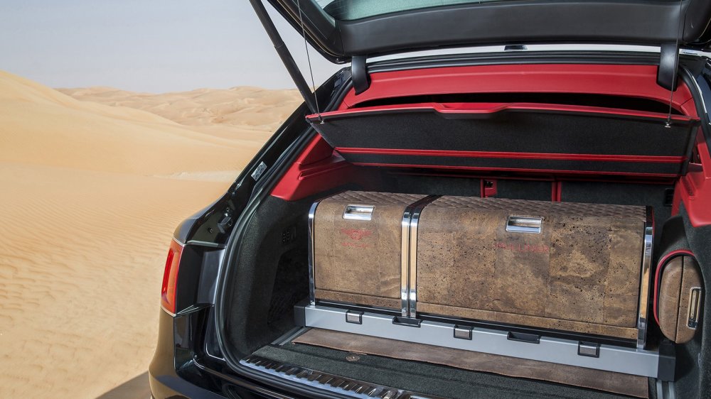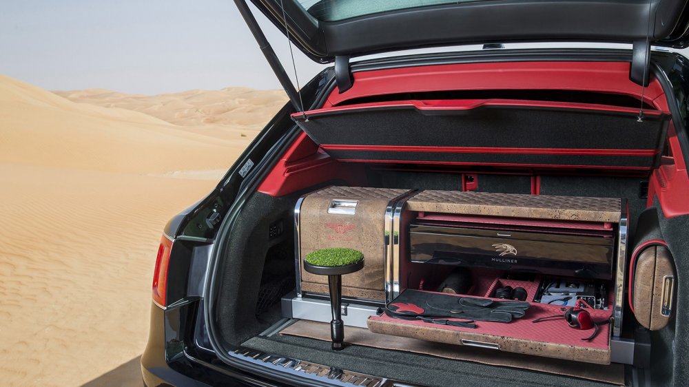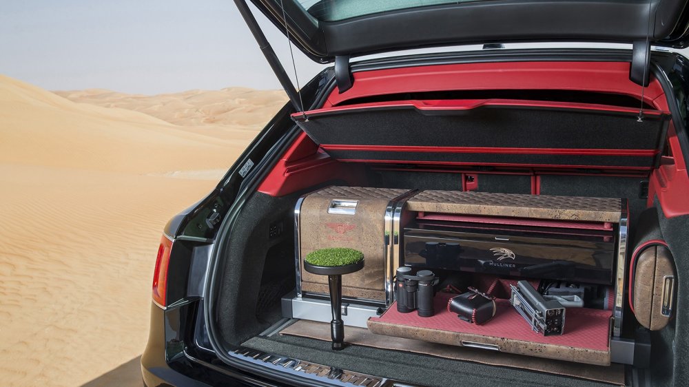 Багажник Бентайги приспособили под два ларца на выдвижной платформе, которые получили уникальную отделку из пробковой ткани. Секция побольше предназначена для хранения GPS-датчиков слежения за птицами, биноклей, клобуков, ножа, охотничьей перчатки. Во втором отделении хранятся термосы, стаканы, одеяльце и влажные салфетки.